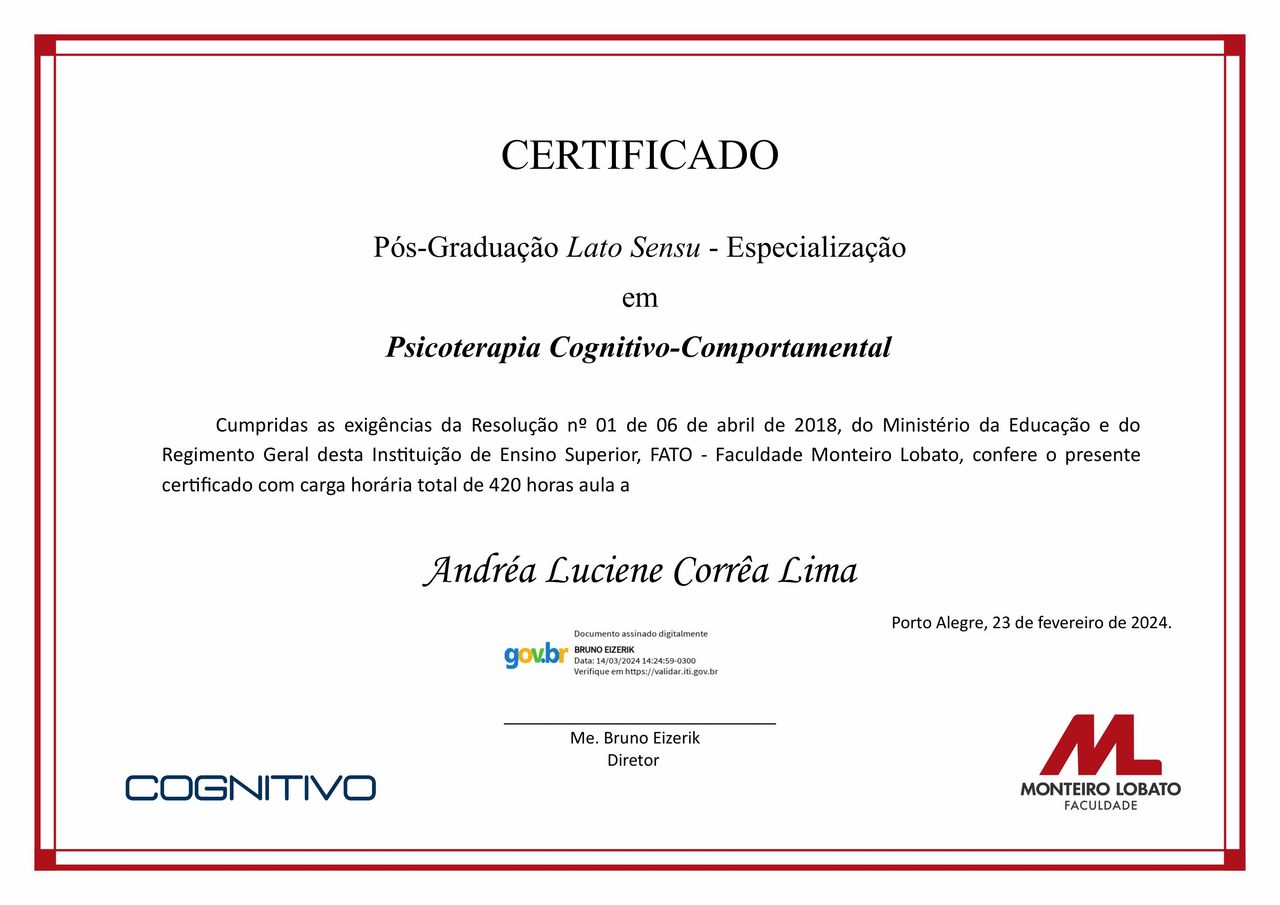 Olá, me chamo Andrea Luciene Corrêa. Sou psicóloga clínica há mais de 27 anos, neuropsicóloga, empresária e sócia majoritária da Clínica Átrio, onde coordeno uma equipe com mais de vinte psicólogos parceiros. Atuo com a Terapia Cognitivo-Comportamental (TCC), abordagem baseada em evidências, eficaz no tratamento de diferentes condições emocionais e comportamentais.